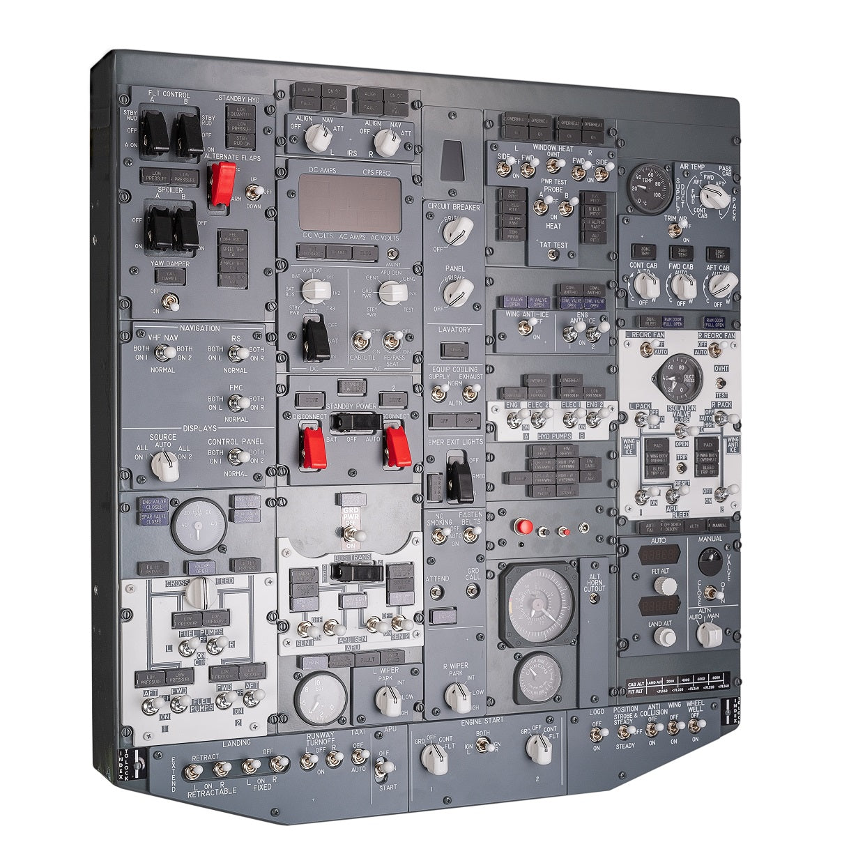 Includes MCP, EFIS, CDU, gear lever, sixpack system, AFDS, clock, lighting, and annunciators.