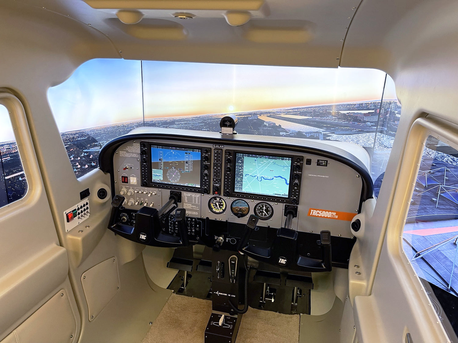 The TRC5000 POD C172G is a full replica of a Cessna 172NG. It comes with real replicated instruments, instead of projected instruments behind a panel with just some holes. Even the TRC1000 units work exactly like the real Garmin G1000. It is very difficult to tell the difference between the inside of a real Cessna 172 and the inside of the TRC5000 POD C172G fully enclosed Flight Simulator.
