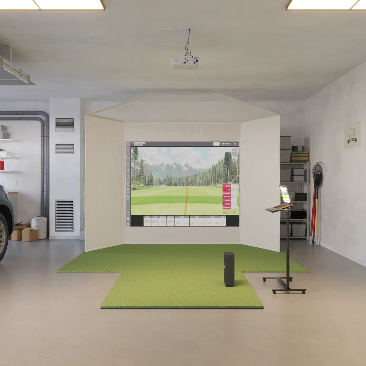 Includes SwingTurf, laser short-throw projector, 25' HDMI cable, fits in 13'W x 15'D x 8.5'H space.